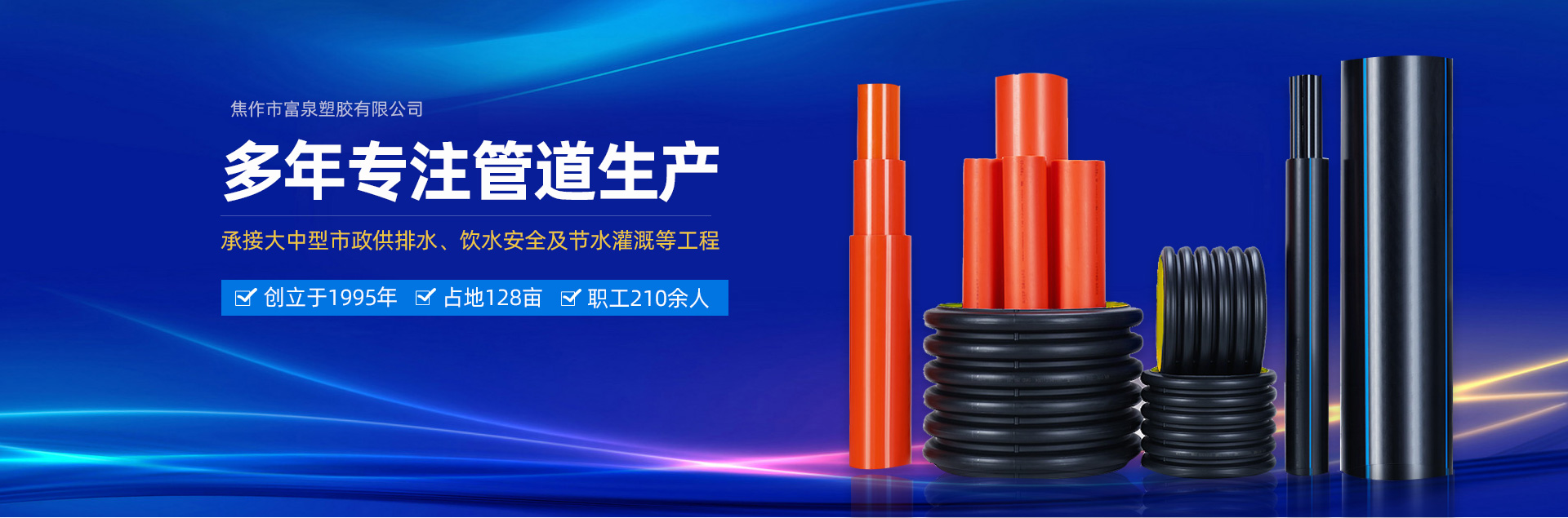 - 焦作市富泉塑胶有限公司,创立于1995年,是一家集研发、设计、生产、销售为一体的大型管材企业。公司位于太极故里、黄河之滨一一河南焦作温县。公司占地128亩,现有职工210余人,其中具有中技术职称的19人。生产、检验设备58台(套),包括PVC实壁管生产线11套、PE实壁管生产线12套、HDPE双壁波纹管生产线6套、PVC双壁波纹管生产线5套,检验设备14台(套)。主要产品有:Φ20mm-630mm、各种压力规格的PVCU、PVC-M、PE给水管材,PVC-U节水灌溉管材,HDPE燃气和矿用管材,DN200-800mm的HDPE、PVC双壁波纹管及各种喷灌、滴灌工程材料。承接大中型市政供排水、饮水安全及节水灌溉等工程?! 「蝗芙汗局厥硬返闹柿?、安全、环保和节能,在同行业中率先完成了“新华节水产品认证”,全方面通过ISO9001:2008国际质量管理体系、IS014001:2004环境管理体系和OHSAS18001职业健康安全管理体系的一体化导入,并建立起规范的现代企业管理体系。公司以“质量”为先导,采用质量跟踪、多环节把关的方法,组建具有行业水准的企业技术检测中心,常年委托水利部节水灌溉设备检测中心、河南省产品质量监督检验院对产品跟踪检测,并由中国人民保险公司承保产品质量。公司连续多年被河南省水利厅确定为“安全饮水设备、节水灌溉设备”定点生产企业,并获得“中国名优产品”“质量、服务、信誉AAA企业”“河南省**产品”“河南省水利企业”“河南省守合同、重信用企业”等荣誉称号。 富泉塑胶公司坚持“用户为上”的服务理念,长期以来,全方面关注客户价值,不断提升服务水平。服务队伍常年为客户的产品设计、施工、安装提供合理的方案和全程细致、周到、**、快捷的技术服务。公司自成立以来,一直坚持以人为本的宗旨,塑造企业形象,并致力于新产品的开发,凭借雄厚的技术开发能力,先进的工艺制造流程,严格的质量管理保证体系,优良的售后服务网络,已成为河南省大的饮水、灌溉及排水管材设备制造商。产品畅销全国,而且还以公司雄厚的综合实力在业界中占据着重要的地位。